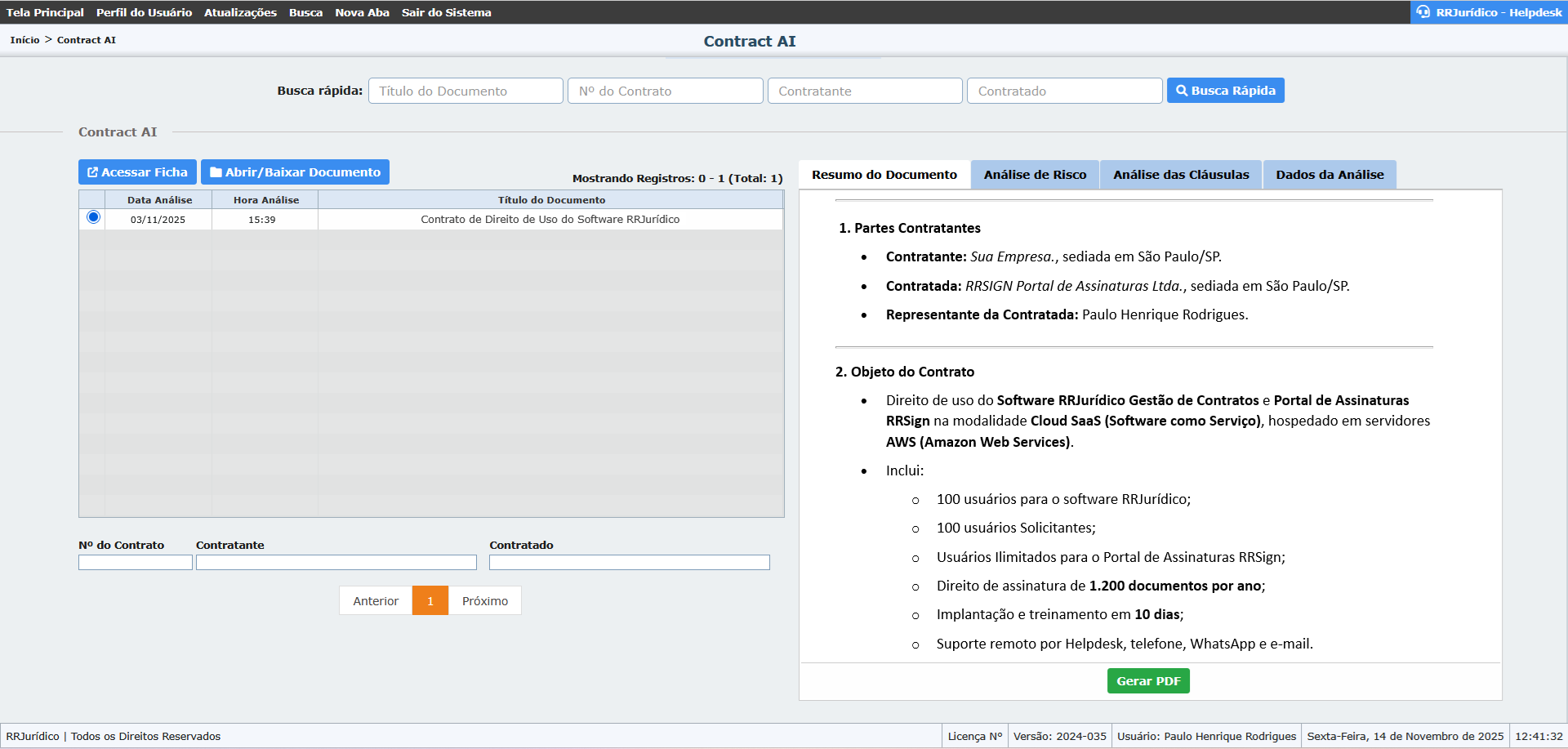 Ao final da verificação, a Contract AI gera um relatório de conformidade que pode ser integrado diretamente ao módulo de workflow contratual do RRJurídico, possibilitando a aprovação interna e o arquivamento automatizado dos contratos revisados.
