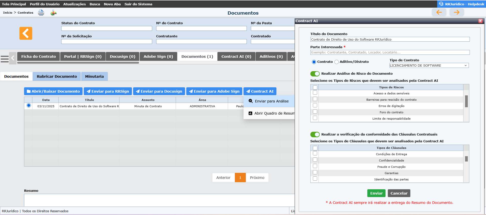 Entre suas funcionalidades estão a detecção de contradições nas cláusulas, limites de responsabilidade, foro inadequado, multas desproporcionais e riscos relacionados à LGPD.