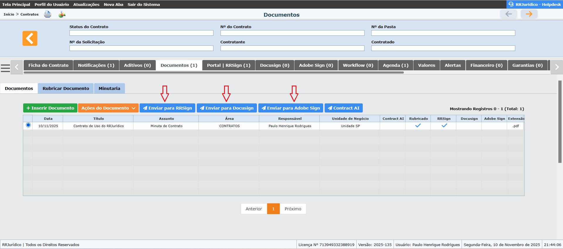 No RRJurídico, a assinatura não é um processo paralelo: ela faz parte do workflow do contrato. Assim que o documento é concluído na Minutaria e aprovado nas fases internas, o usuário pode enviá-lo para assinatura eletrônica diretamente do sistema.